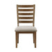 The traditional styling of the Tigard Collection lends timeless appeal to the look of your casual dining space. With subtle hints nodding to the Arts and Crafts design movement, the ladder-back side chair features classic lines that solidify the versatile aesthetic of the collection. Covering the padded seats of the side chairs is a neutral tone fabric upholstery, complementing the traditional cherry finish of the chair’s wood veneer. 20 x 22.5 x 38H
