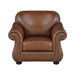 The traditional style of your home is perfectly complemented by the addition of the Attleboro Collection. Plush seating is covered with camel brown top-grain leather where the hand touches, and faux leather-match covering the remaining areas. Rolled arms elegantly curve, their fronts and the base rail of the chair accented with nailhead trim. 42 x 40 x 37.5H