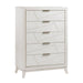 Bold geometrical styling is paired with unfettered modern lines to create the unique design of the Asteria Collection. An antique white finish highlights the collection’s oak veneer. Flat black finished metal bar hardware fronts the drawers of the chest. Asymmetrical routing fronts the drawer faces for dramatic accent to the collection.