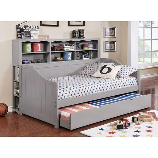 Homelegance (Fremont Warehouse)Maximizing sleep space is achieved with the stylish Orion Collection. This transitional twin corner bookcase bed is featured in a gray finish makin...