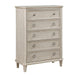 In a modern look on traditional design, the Leander Collection combines refined lines with classic accenting to create an elegant statement for your bedroom. Clipped corners define the profile of the chest while picture frame molding lends detail to the fronts of each drawer, and pilasters. Weathered nickel ring pull hardware centers the drawers with the chest also featuring knob hardware on the top drawer. The oak veneer of the collection is finished in light brown.
