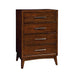 SNYDER Brown Cherry Chest, 34"W X 18"D X 48"H, 99lbs. Gorgeous lines and sleek bases give this bedroom furniture a distinctive contemporary edge. This transitional style bedroom collection adds modern comfort and stylish elgance to any bedroom settings. Features: Transitional Style Chrome Handles Center Metal Glides Solid Wood, Wood Veneer, Others Brown Cherry Finish