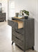 The diagonal replicated grain meet at the center line, forming a V-shaped pattern found on the front panels. Contemporary elements continue throughout this ensemble, with the black angled legs and sleek finger pulls found on the matching case goods. Coordinating pieces like this set offer a stress-free experience in updating your bedroom decor.