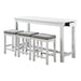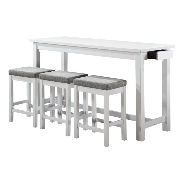 The elevated dining experience that the Connected Collection provides will fuel your device’s battery life while you fuel yourself. The convenience of built-in USB ports and A/C power turns your casual dining area into an efficient recharging station. The four-piece pack of the Connected Collection includes a counter height table and three barstools. A single drawer allows for discrete storage on the table’s side apron. As a neutral pallet for your decorative preference, the collection features a white finish, with the neutral gray tone of the barstool’s seats providing subtle accent. Table: 66.25 x 23.75 x 36.5H, Chair: 17 x 12 x 24.25H