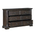 The elegant stature of the Cornwall Collection is solidified in its prominent placement in your bedroom. The dresser features corbel accented pilasters, and traditional framing. An espresso-hued finish complements the oak veneer of the piece while flat black knob hardware fronts the drawers of the dresser. 66.5 x 19.5 x 41H