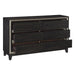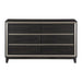 The Grant Collection features a streamlined profile and visual complementing contrast, with the resulting design being a perfect fit for your modern home. An ebony finish is utilized over oak veneer, highlighting the distinct grain, with silver finished banding defining the front of the dresser. Hidden, under-drawer finger pulls further the minimalistic look of the piece. 60 x 17 x 35.5H