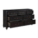 The traditional profile of the Herman Collection is achieved with a perfect blend of classic elements that create a look that complements the style of your bedroom. Turned feet provide support to the classic design of the dresser. The piece features charcoal brown finish, over birch veneers, highlighting the beautiful wood grain. An antiqued finish lends elegant patina to the traditional hardware of the dresser’s drawer fronts. 63.5 x 17 x 36H
