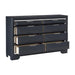 The modern design of the Rosemont Collection creates a striking profile for your bedroom. The midnight blue finish is reflected by the chrome banding that defines the front of the dresser. Chrome pull hardware accents each of the raised drawer fronts. 60.5 x 17 x 40H