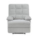 Easing into your favorite recliner whether to catch a game, watch a movie or have a nap, allows you to rest and recharge, and the Colin Collection provides that perfect spot. Covered in light gray velvet fabric upholstery, the hue is a neutral color for your living space. Square tufted panels comprise the seatback design with pillowtop arms rounding out the elevated level of comfort. Engaged with the pull of the side-mounted tab, the manual reclining mechanism takes you from seated to prone in an easy motion. 35 x 36 x 40.5H