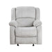 A solid pairing to your transitional living room, the Fairview Collection’s decorative versatility, and plush seating create a glide- reclining chair that is a complement to your lifestyle. Gray chenille fabric upholstery covers the chair, the neutral hue lending unobtrusive style to your space. The manual motion mechanism of the piece is engaged with a pull of the side-mounted tab, transitioning you from seated to reclined. The contoured seat structure of the glider-recliner is amply paired with pillowtop arms maximizing your comfort. 35 x 38 x 40.5H