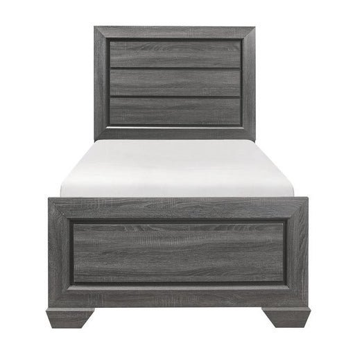 Homelegance (Fremont Warehouse)Beechnut Collection by Homelegance Furniture Gray finish Dark under-panelling Embossed faux wood This bed requires a boxspring 41.75 x 80.25 x 53.5H