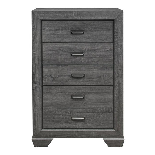 Homelegance (Fremont Warehouse)Beechnut Collection by Homelegance Furniture Gray finish Dark under-panelling 5 Drawers Embossed faux wood Contrasting cup hardware 33 x 16.5 x 50H