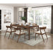 Mid-Century Modern inspires the design of the Leawood Collection dining offering. Beige textured fabric upholstery covers the seats and backs of the contoured wood-framed side chairs. The collection features walnut veneer with walnut finish, solidifying the classic presentation.