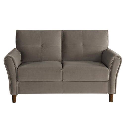 Homelegance (Fremont Warehouse)With a tailored look that is achieved with flared arms, clean lines, and a gray velvet cover, the love seat of the Dunleith Collection provides bol...