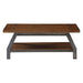 Heavily influenced by industrial design, the Holverson Collection will lend a unique look to your personal space. Gunmetal finished wood framing provides sturdy structure and profile to this cocktail table offering. Faux rivets provide additional detail to the metal bracketing that is prominently on display. A rustic brown milk crate finish is utilized to highlight the acacia veneer. Open shelving allows for prominent display of your favorite decorative items. Coordinating end table, sofa table, dining, home entertainment and bedroom are also available. 48 x 28 x 18H