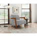 Introduce a touch of mid-century modern charm and exceptional comfort to your living space with this beige chenille armchair. Featuring a sturdy solid wood and plywood frame, a dacron wrapped foam seat cushion, and soft chenille fabric upholstery, this chair offers both durability and a luxurious seating experience. The solid wood arms and legs in a rich chestnut finish provide a warm, elegant foundation. With a 300lb weight capacity and easy assembly, this armchair is perfect for enhancing your living room, bedroom, or reading nook with a blend of style and practicality